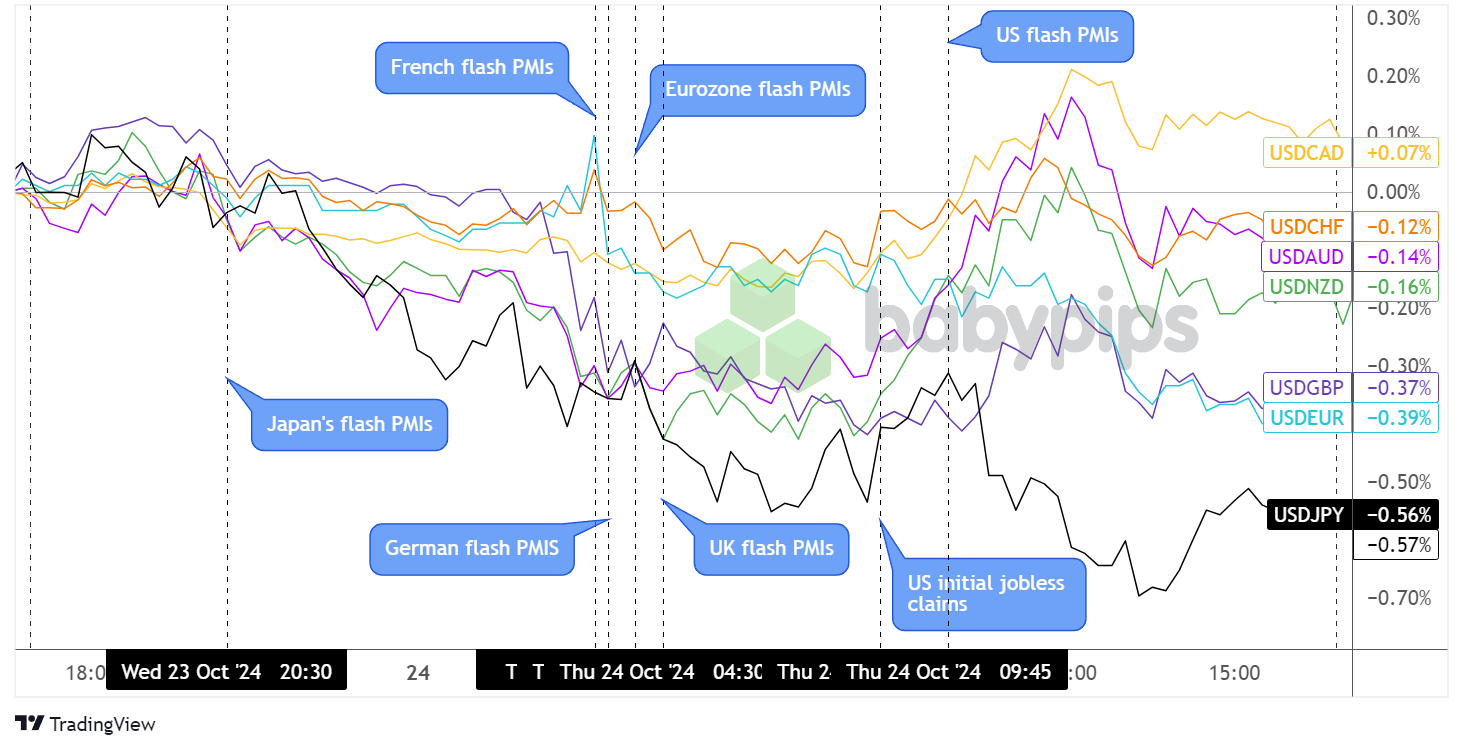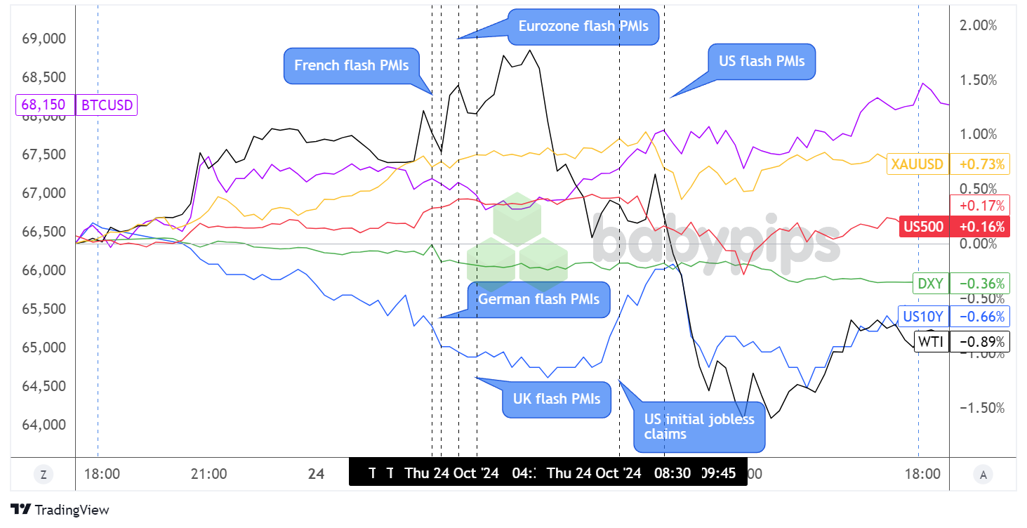 The market spotlight was on global flash PMI reports, which printed mixed results across major economies.