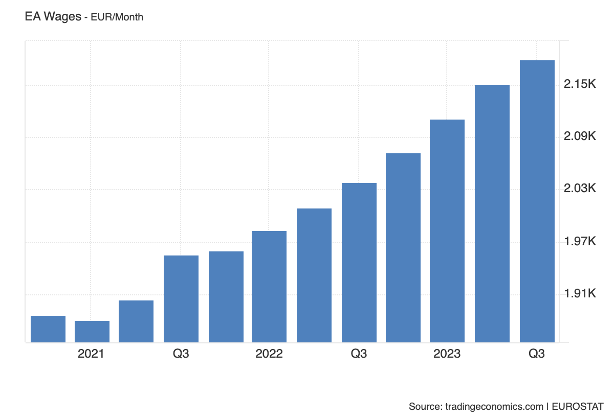 According to official Wage Growth data, Eurozone wages rose 4.5% in the second quarter which, though lower than the 5.2% in the previous quarter, remained high. There is still no data for Q3, however, but the Eurozone Average Monthly Wage continues to rise quite strongly, reaching EUR 2,180 in September.