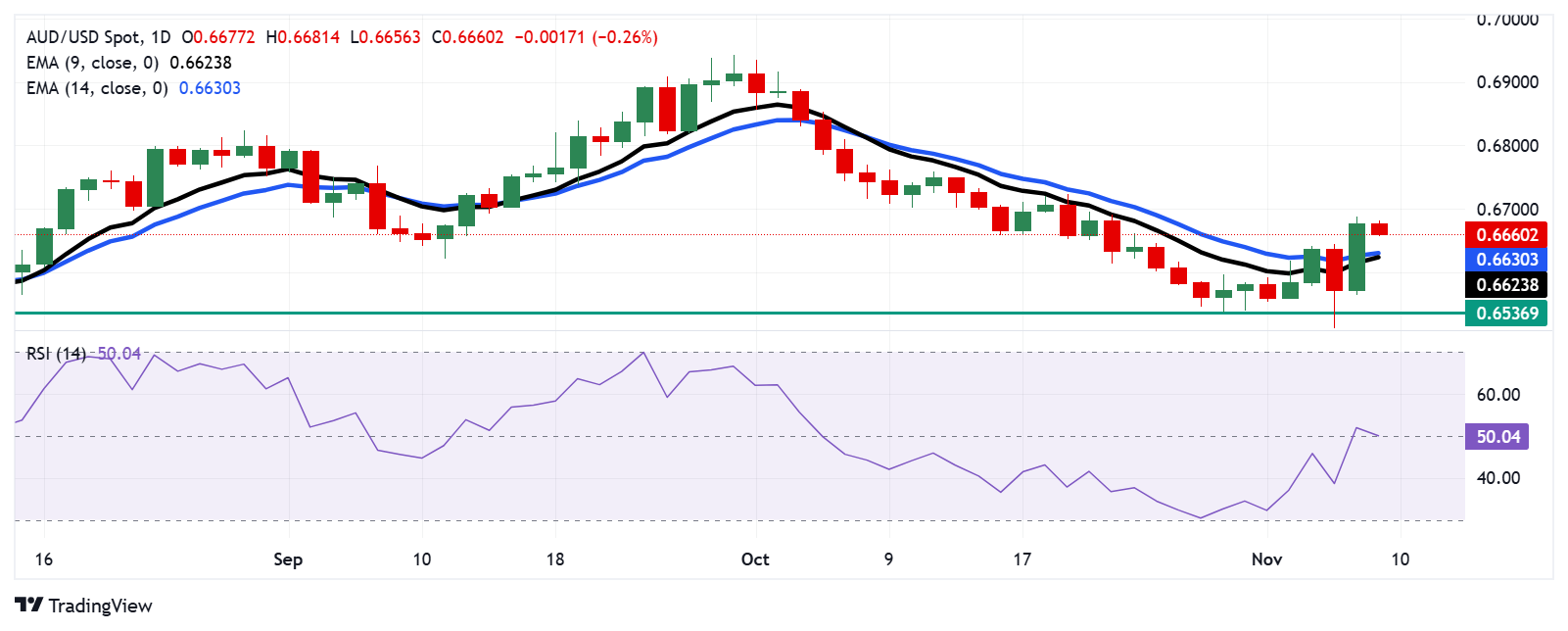 The AUD/USD pair trades near 0.6660 on Friday, showing a shift from bearish to bullish momentum on the daily chart. The pair has moved above the nine- and 14-day Exponential Moving Averages (EMAs), signaling short-term upward momentum. Furthermore, the 14-day Relative Strength Index (RSI) has crossed above the 50 mark, suggesting an ongoing bullish sentiment.