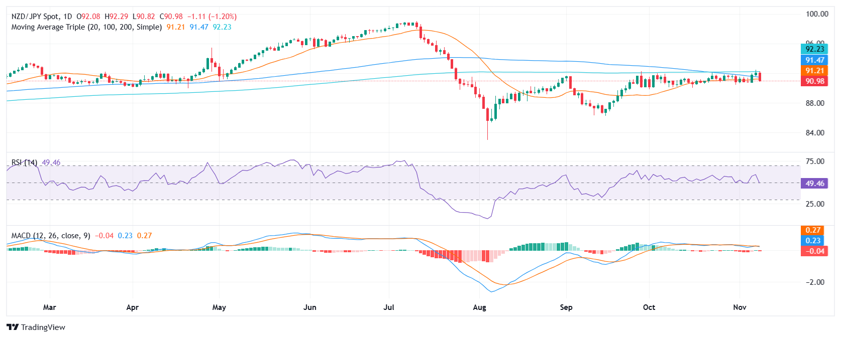 In Friday’s session, the NZD/JPY declined by 1.20% to 91.00, continuing its bearish momentum. This break below the crucial 91.00 support level and the convergence of the 20 and 100-day Simple Moving Averages (SMAs) further confirms the strength of the selling pressure.