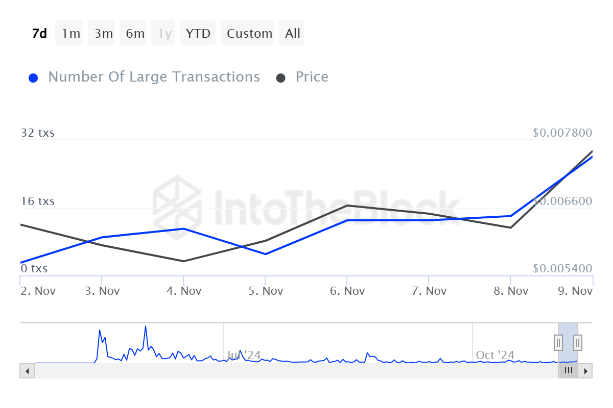 Additionally, Notcoin’s Number of large transactions has surged by 833.3% over the past week. This shows that large holders and whale activities are very high especially accumulation.