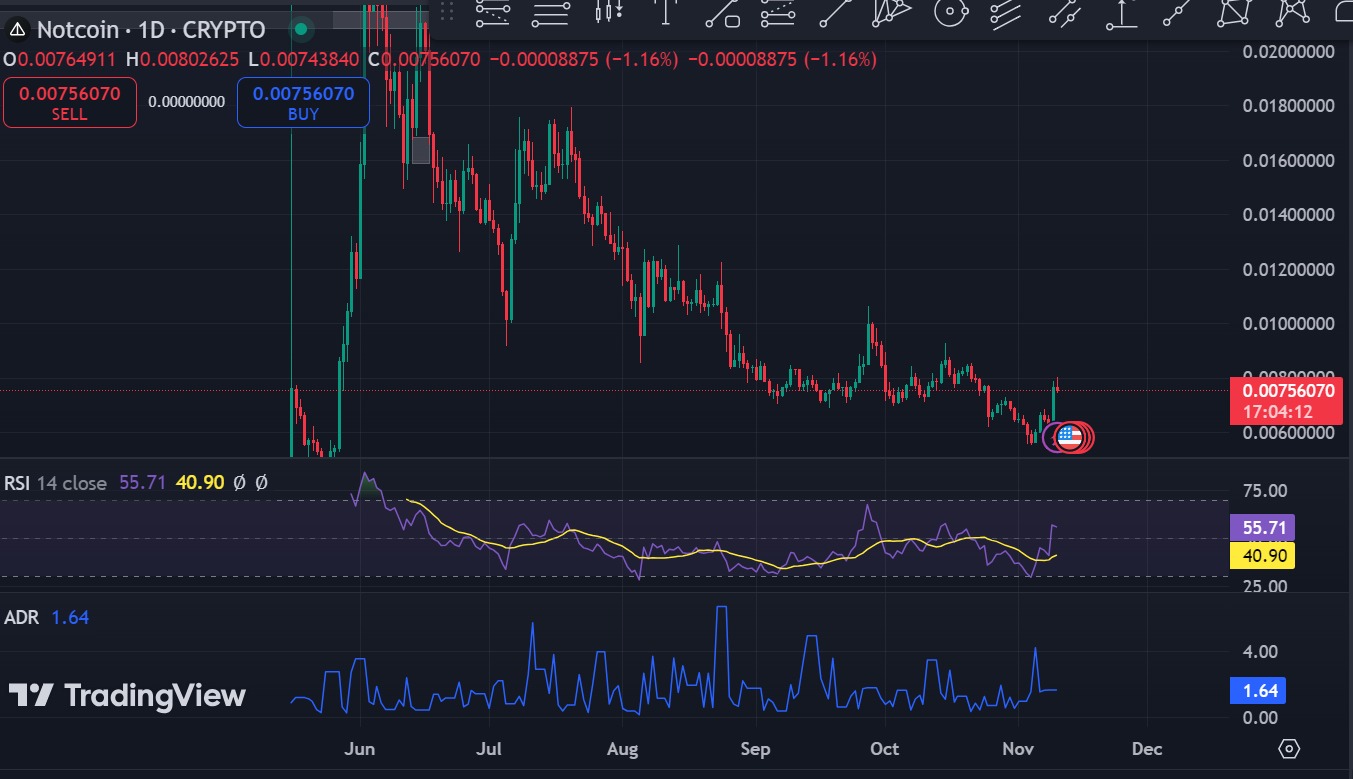 As observed above, Notcoin is experiencing a strong upward momentum. After a breakout from the falling wedge pattern and positive market sentiment, these conditions could set the altcoin for further gains.
