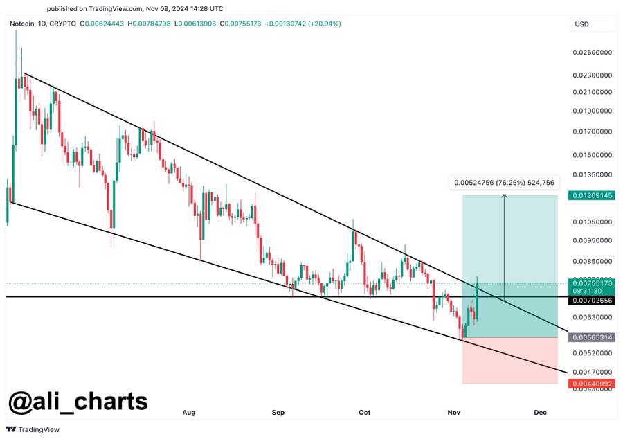 - Notcoin breaks out of a falling wedge indicating a potential 76% upswing.