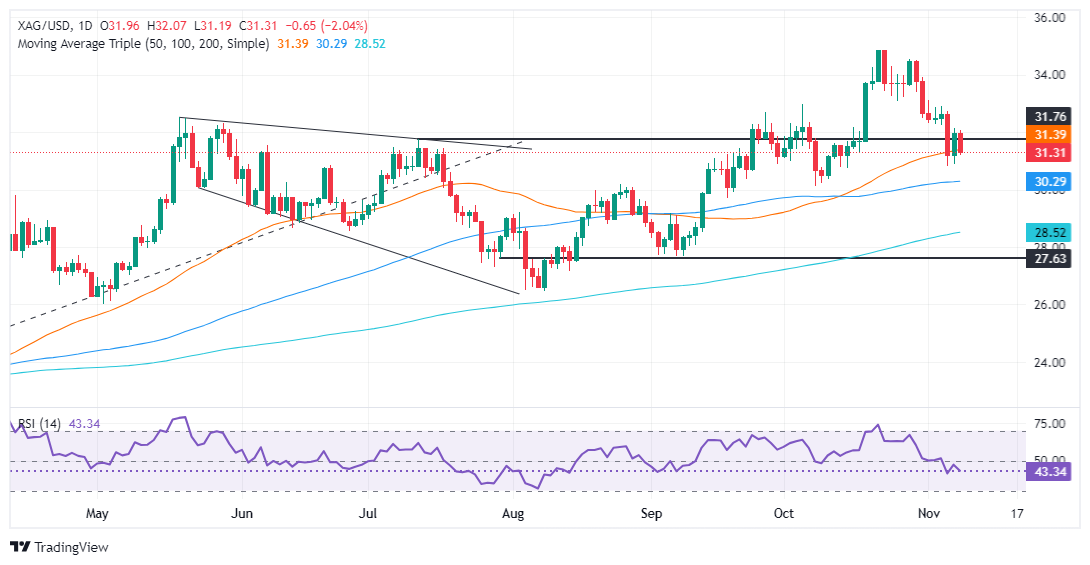 Silver retreated from two-day highs of $32.00 and tumbled below the 50-day Simple Moving Average (SMA) at $31.37 late in the North American session. This was weighed down by a strong US Dollar underpinned by former President Donald Trump’s victory. At the time of writing, the XAG/USD trades at $31.29, down 2.29%.