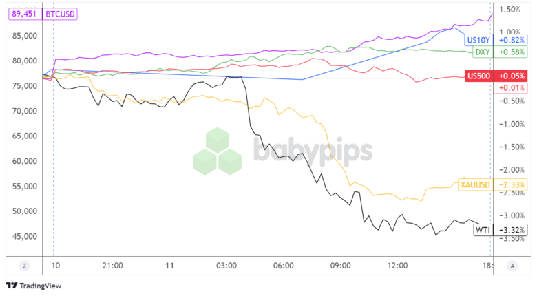 Dollar Index, Gold, S&P 500, Oil, U.S. 10-yr Yield, Bitcoin Overlay Chart by TradingView