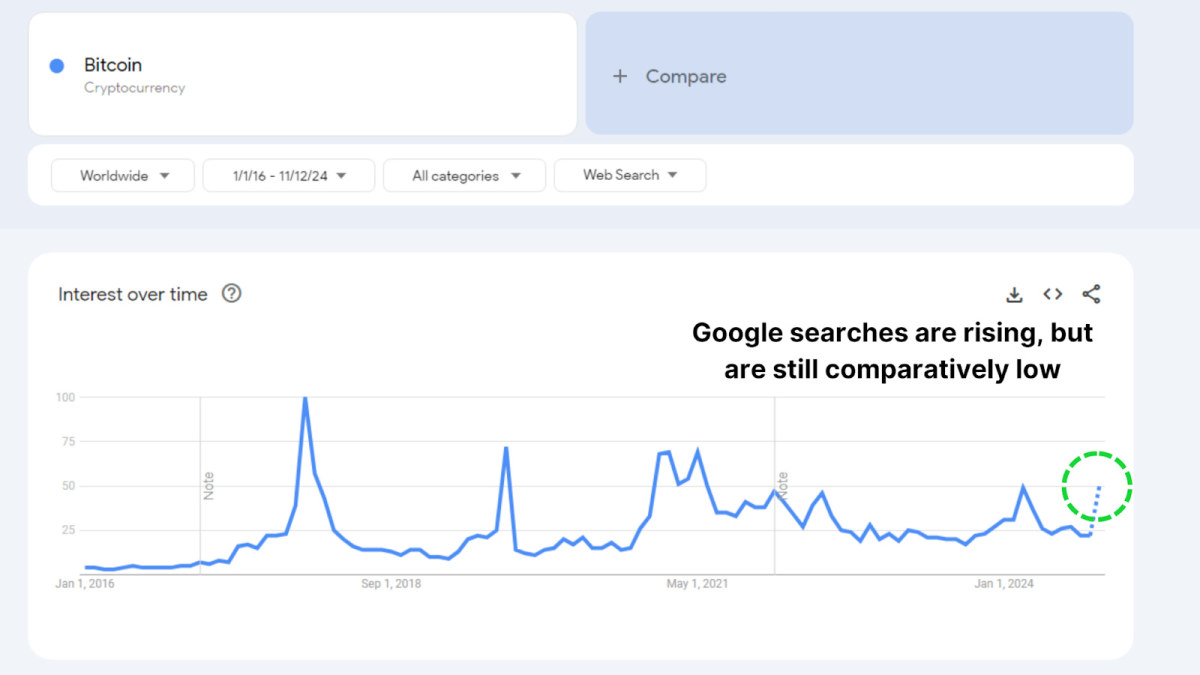 Google Trends also reflects this tempered interest. Although searches for “Bitcoin” have been increasing in the past month, they remain far below previous peaks in 2021 and 2017. It seems that retail investors are showing a renewed curiosity but not yet the fervent excitement typical of FOMO-driven markets.