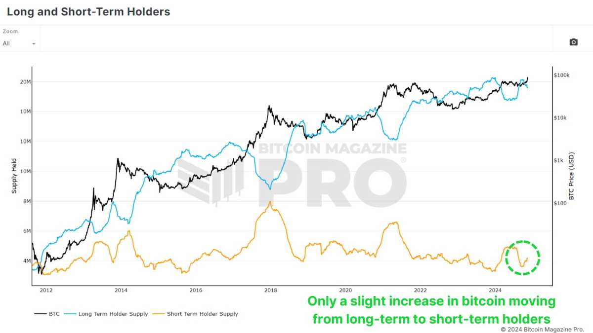 Historically, during the last bull run in 2020-2021, we saw large outflows from long-term holders to newer investors, which fueled a subsequent price rally. Currently, the shift is only minor, and long-term holders seem largely unfazed by current price levels, opting to hold onto their Bitcoin despite market gains. This reluctance to sell suggests that holders are confident in further upside potential.