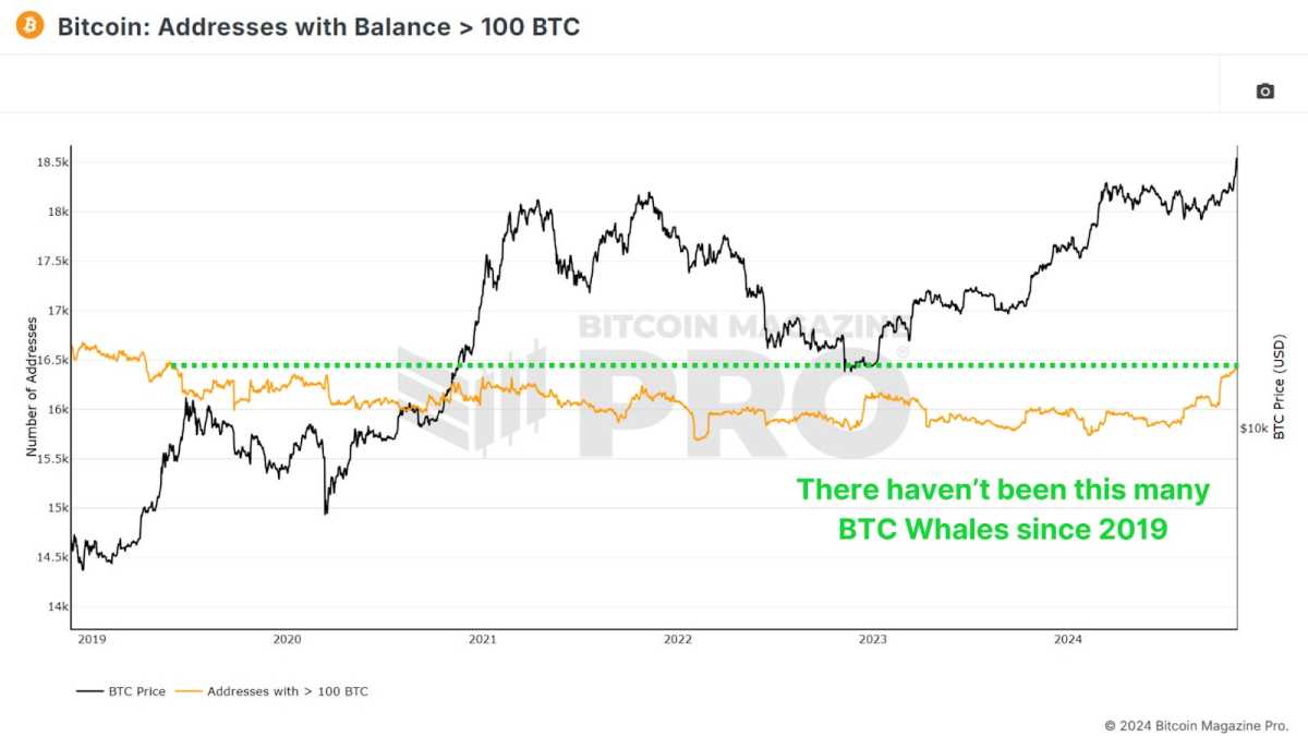 Interestingly, while retail addresses haven’t increased substantially, “whale” addresses holding at least 100 BTC have been rising. Over the past few weeks, wallets with large BTC holdings have added tens of thousands of coins, amounting to billions of dollars in value. This increase signals confidence among Bitcoin’s largest investors that the current price levels have more room to grow, even as Bitcoin reaches all-time highs.