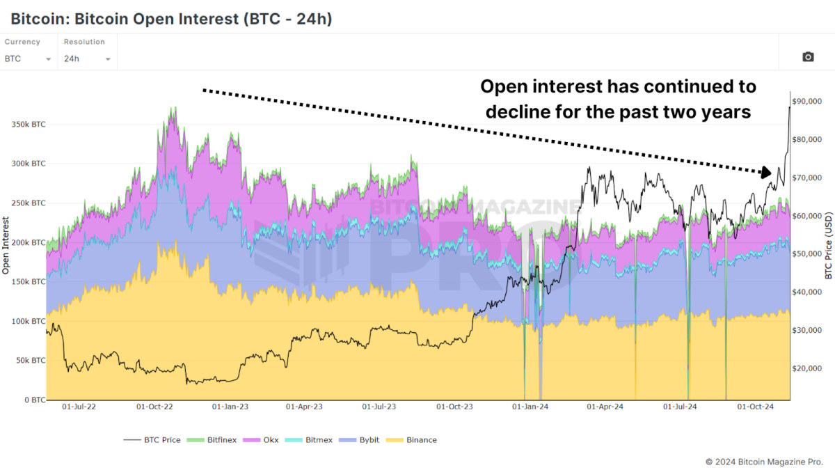 A key aspect of Bitcoin’s latest rally is its spot-driven nature, in contrast to previous bull runs heavily fueled by leveraged positions. Open interest in Bitcoin derivatives has seen only minor increases, which stands in sharp contrast to prior peaks. For instance, open interest was significant before the FTX crash in 2022. A spot-driven market, without excessive leverage, tends to be more stable and resilient, as fewer investors are at risk of forced liquidation.