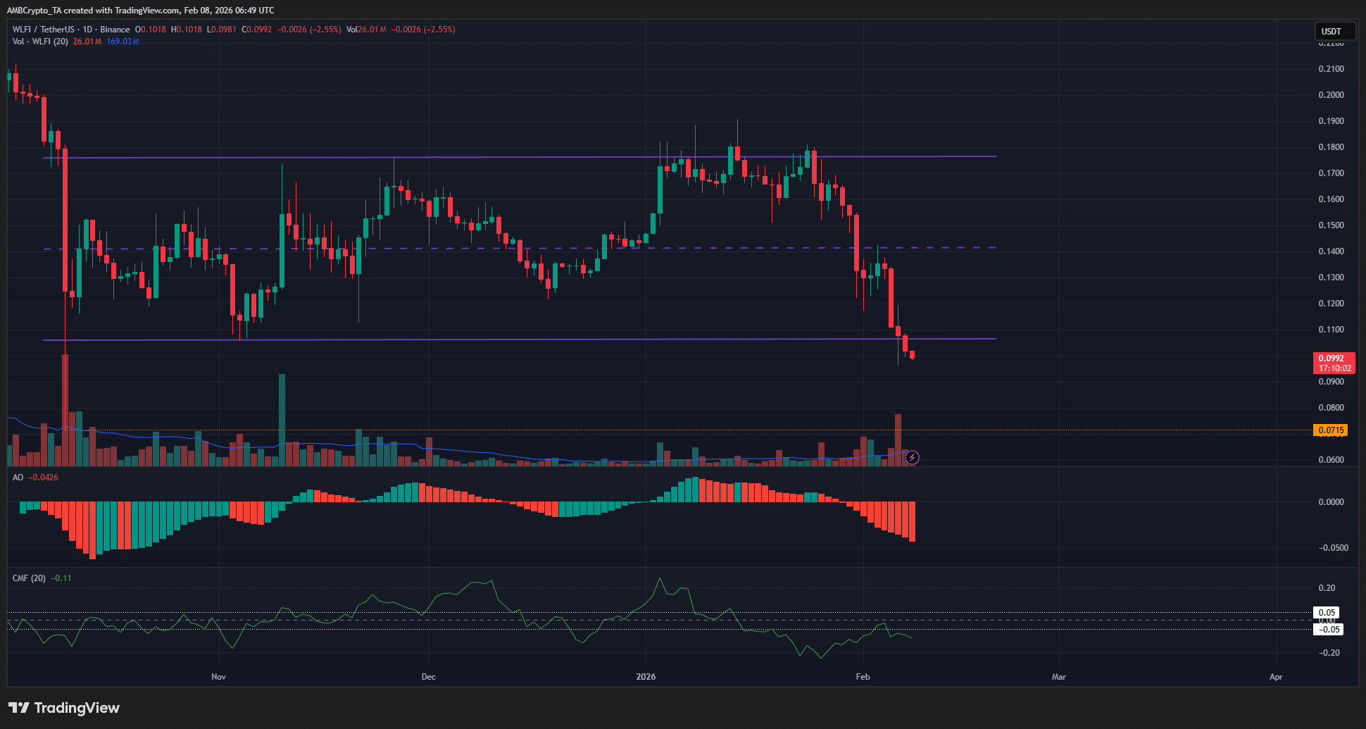 Bitcoin [BTC] and the rest of the crypto market recorded double-digit percentage losses over the past week, and WLFI was forced below the lows of a 3-month range. WLFI’s $50 million Bitcoin sale reflected a lack of conviction in the market, compounded by BTC’s spot ETF outflows.