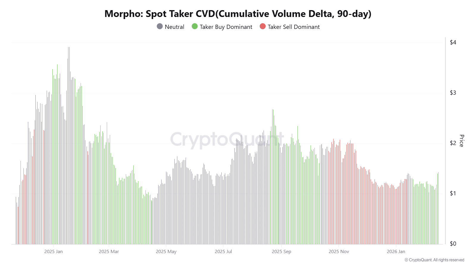 The 90-day Spot Taker CVD continues to show dominant buyer activity, signaling aggressive market orders absorbing available liquidity.