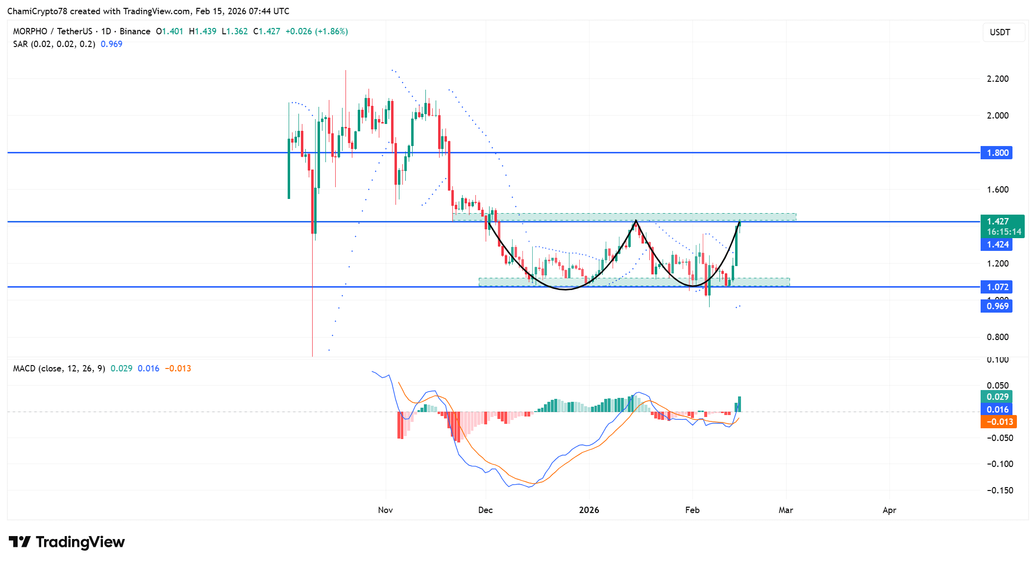 MORPHO has completed a clear double-bottom formation after defending the $1.07 demand zone twice and reclaiming the $1.42 neckline with conviction.