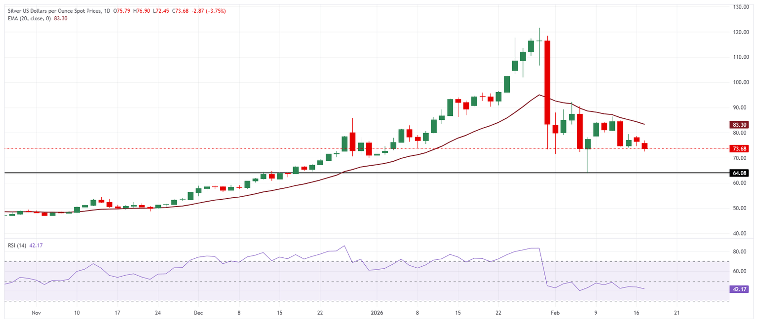 In the daily chart, XAG/USD trades at $73.68. The 20-day exponential moving average descends to $83.30, signaling a weakening short-term structure. Price holds below this gauge, keeping rebounds capped and leaving sellers in control. RSI (14) at 42.17 (neutral) stays under the midline, indicating momentum favors the downside without oversold conditions.