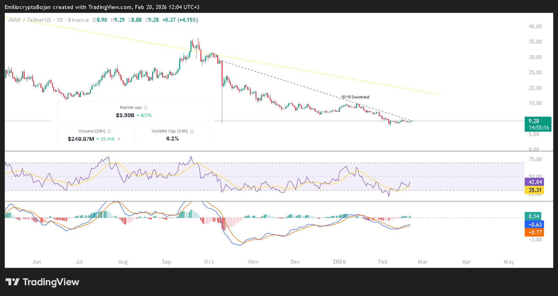 On the 20th of February 2026, AVAX saw renewed activity as volume climbed 25 percent to $248.87 million. It traded around $9.25, pushing into the descending trendline formed after the October 10 crash. That violent selloff marked the start of a prolonged grind lower.