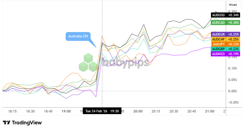 AUD advanced 0.34% against USD a few hours after the numbers were printed, followed by a 0.30% lead against CAD. Gains against NZD were limited at 0.19% while raking in a 0.23% uptick against GBP.