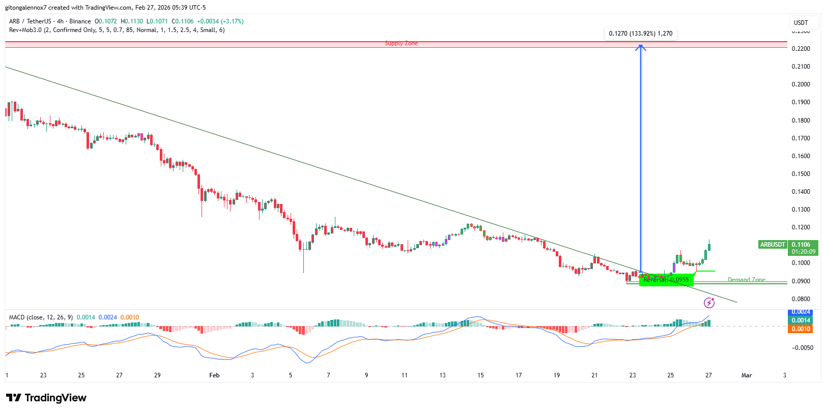 On the charts, ARB’s price bounced from the demand zone at $0.0955, as seen from the Reversal Detection indicator. The reversal occurred as the price traded near the slanting resistance that has been in place since 14 February.