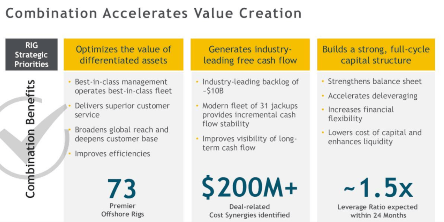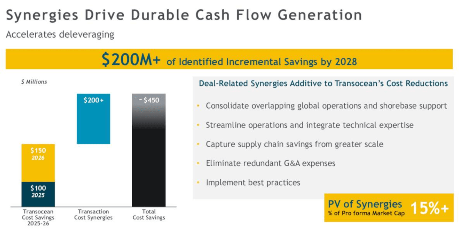 Also, between 2025 and 2026 Transocean alone would decrease its costs by a whopping $250 million. The cost savings from the transaction would total $200 million, which leaves us with total cost savings of $450 million.