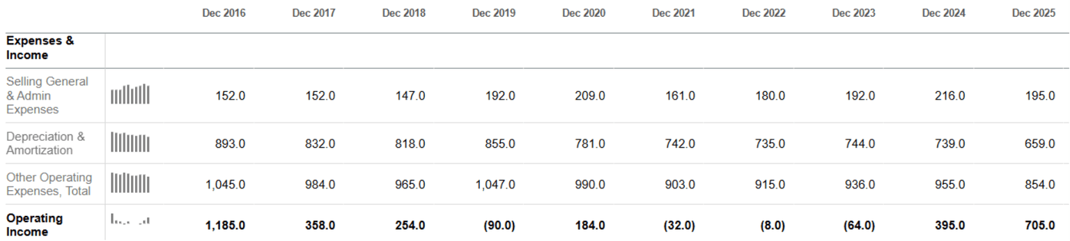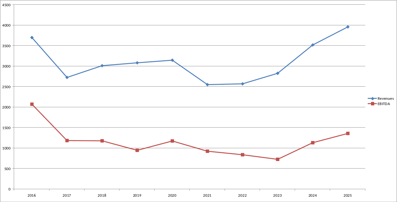 The company’s yearly adjusted EBITDA totaled $1.37 billion, while its free cash flow for the past year was $626 million. As RIG’s CEO said, “during the year, we materially strengthened the balance sheet, retiring about $1.3 billion in debt…These actions and the additional debt payments made in 2025 reduced our annual interest expense by nearly $90 million, enhanced our financial flexibility and increased the value of our equity currency, ultimately enabling the recently announced transaction with Valaris.” As I have mentioned above, Transocean does a great job deleveraging its balance sheet. But what does the $1.37 billion EBITDA mean in the context of Transocean’s earnings history? I have composed a table and a diagram summarizing RIG’s annual EBITDA and sales revenues as given by Seeking Alpha. Please note that the offshore driller has been recording negative net profits for a while due to the fact that it keeps scrapping its cold-stacked rigs.