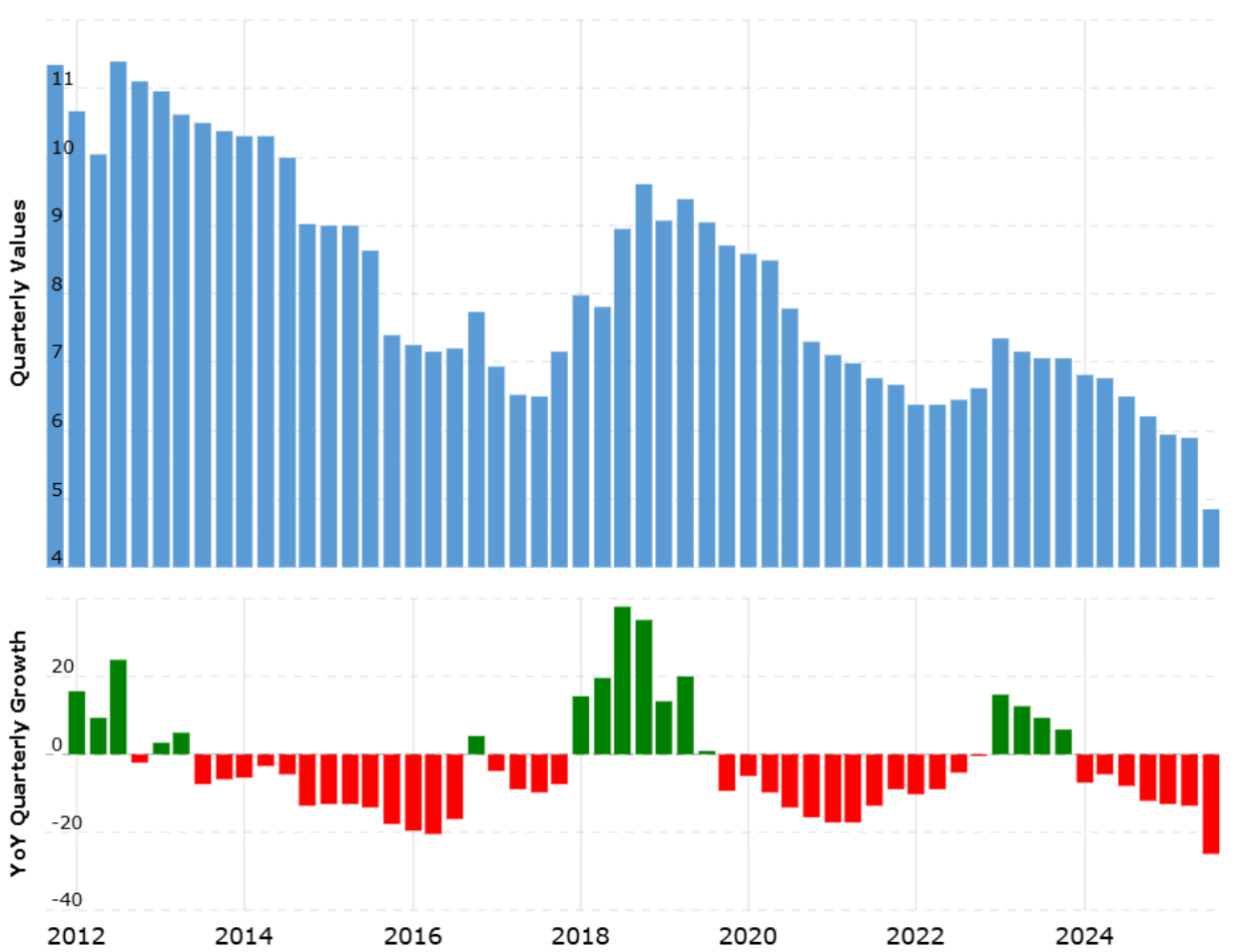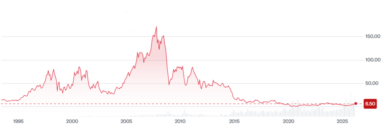 The graph above shows Transocean’s stock price history. In 2016 when its annual sales were below the ones reported for 2025, the stock used to trade for more than $16 per share. Now the sales are higher but the stock is trading for $6.50 per share.