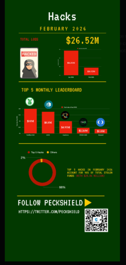 #PeckShieldAlert In Feb. 2026, the crypto space saw 15 main hacks totaling $26.5M, representing a 98.2% YoY decrease compared to Feb. 2025 ($1.5B, including the $1.4B #Bybit drain) and a notable 69.2% MoM decrease from Jan. 2026 ($86.01M in losses).#Top5 Hacks :… pic.twitter.com/Svp7SZWp5w