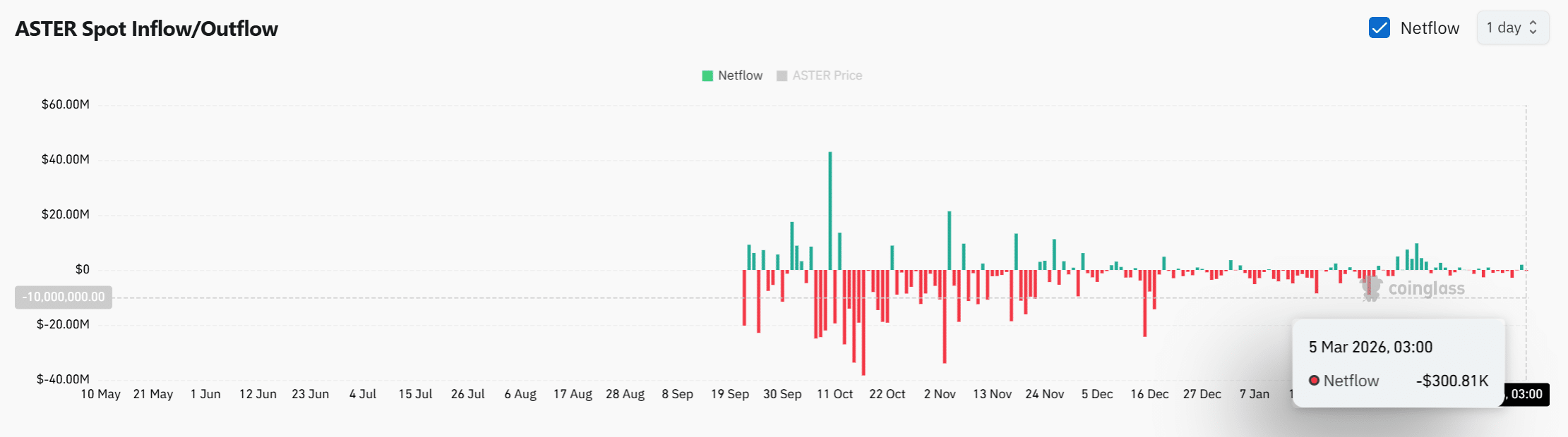 Spot exchange activity now reveals shifting supply dynamics surrounding ASTER. Historical data shows several periods of large negative netflows, which indicate tokens leaving exchanges.
