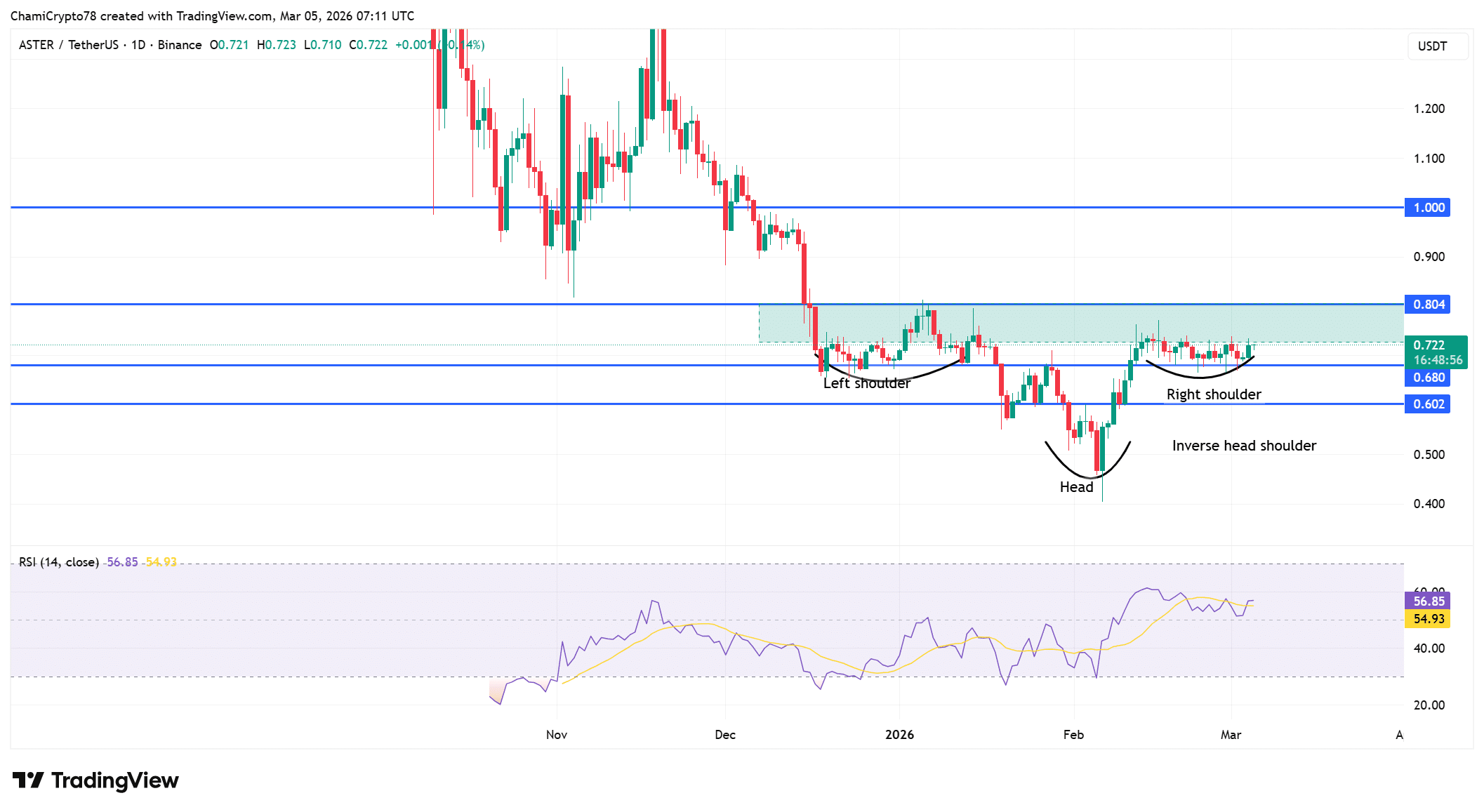 At press time, ASTER was trading near $0.72, with the daily chart showing a developing inverse head‑and‑shoulders pattern in its price structure.
