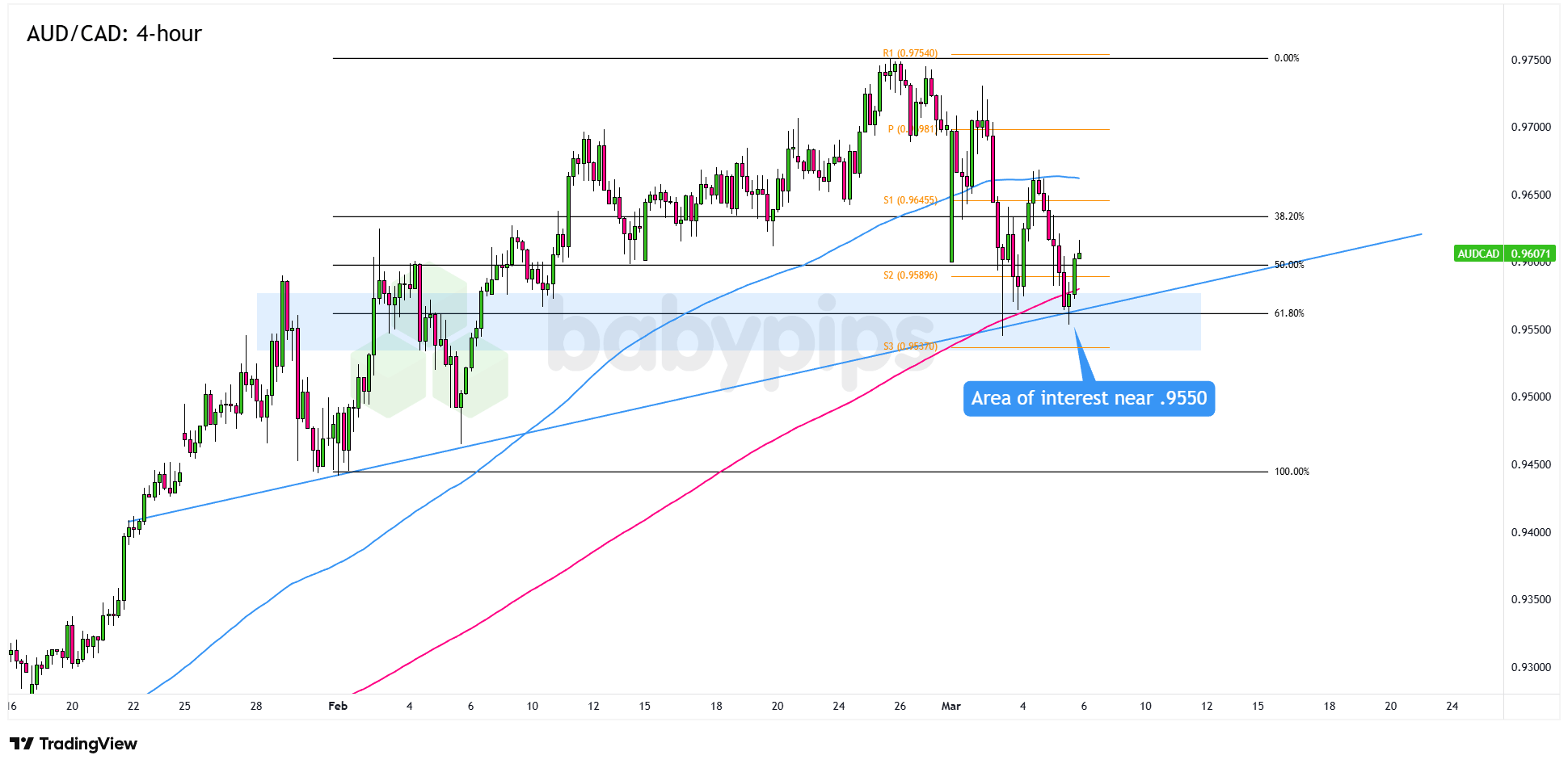 But if AUD/CAD slips back below .9600 or starts trading consistently under its trend line support, then the pair may be looking at a move toward the .9500 inflection point.