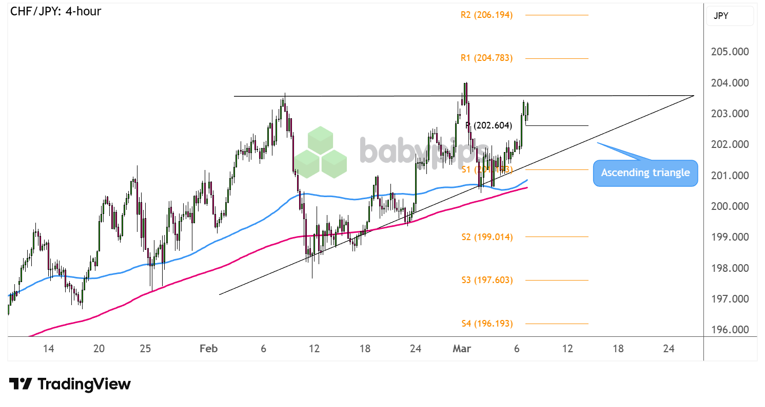 The pair has formed higher lows and found resistance near the 204.00 major psychological mark, creating an ascending triangle on its 4-hour time frame.