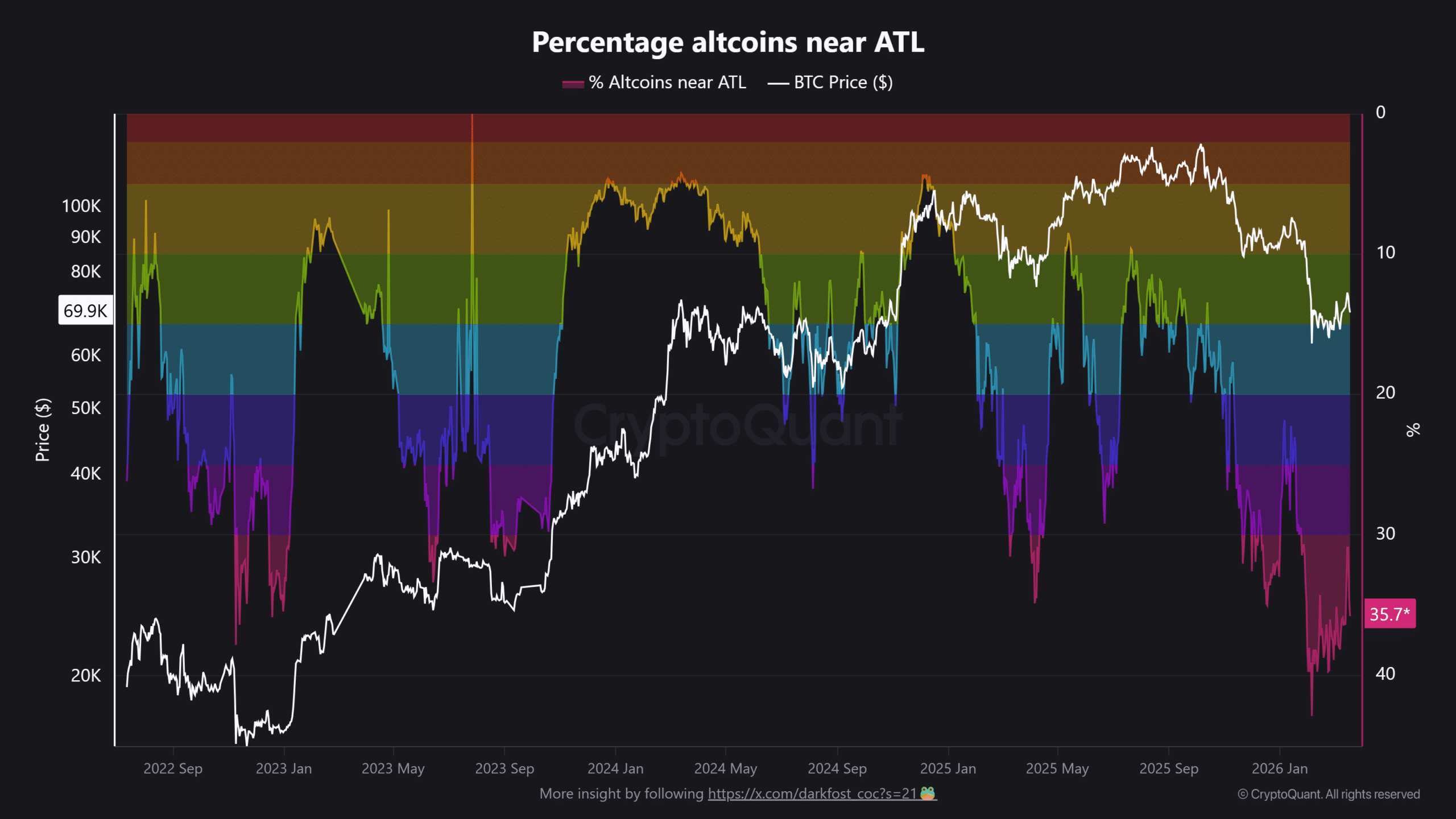 Altcoin weakness deepened as nearly 38–40% of assets traded near all-time lows, pushing the market into clear capitulation territory. As this level rises, it would reflect broad deterioration rather than isolated declines.