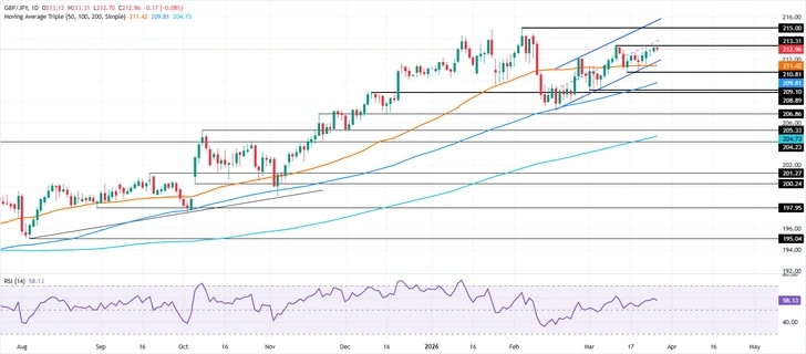 The GBP/JPY consolidates around 213.00 for the second straight day, losses 0.09%, snapping a four-day streak of consecutive gains as traders clash with key resistance at the March 11 peak at 213.31. The technical picture shows GBP/JPY trading within the 211.00-213.00 range over the last 9 days, range-bound amid the lack of a clear catalyst. Additionally, it remains within a bearish flag, which, if confirmed, could open the door for further downside.