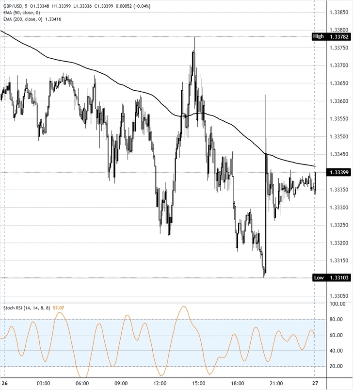 GBP/USD slipped about 0.1% on Thursday, settling around 1.3340 in a choppy session. The pair has been trading in a roughly 200-pip range between 1.3230 and 1.3430 for most of March, with a series of lower highs since the late-January peak close to 1.3820 pointing to a gradual loss of upside momentum. Thursday’s candle showed a brief spike lower toward 1.3310 during the US session before buyers stepped in to recover some ground.