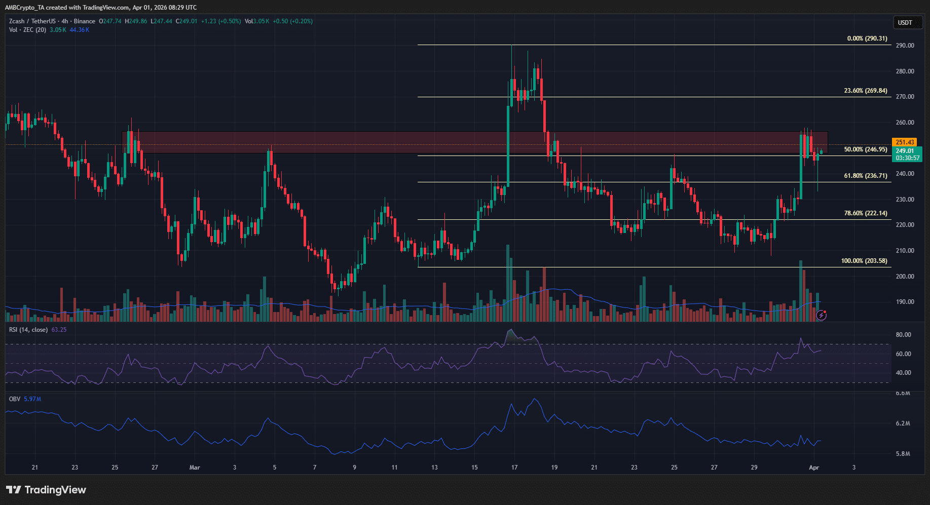 The ZCash H4 chart highlighted a supply zone at the $250 area that has been tested multiple times over the past month.