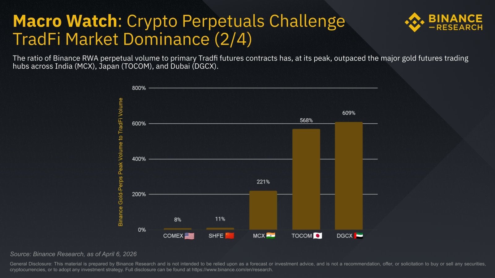 - Gold hit 3.6% of COMEX and silver 13.6% by April, signaling rising crypto price discovery.
