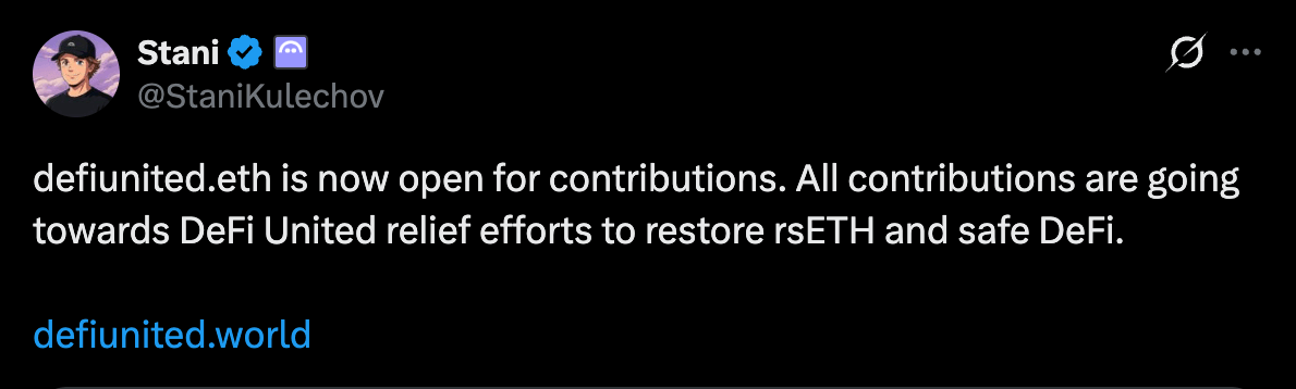 Aave founder Stani Kulechov has also backed a broader initiative aimed at recovery. The “ DeFi United” campaign, now open for contributions, seeks to channel resources toward restoring stability around rsETH and reinforcing safer practices across the ecosystem.